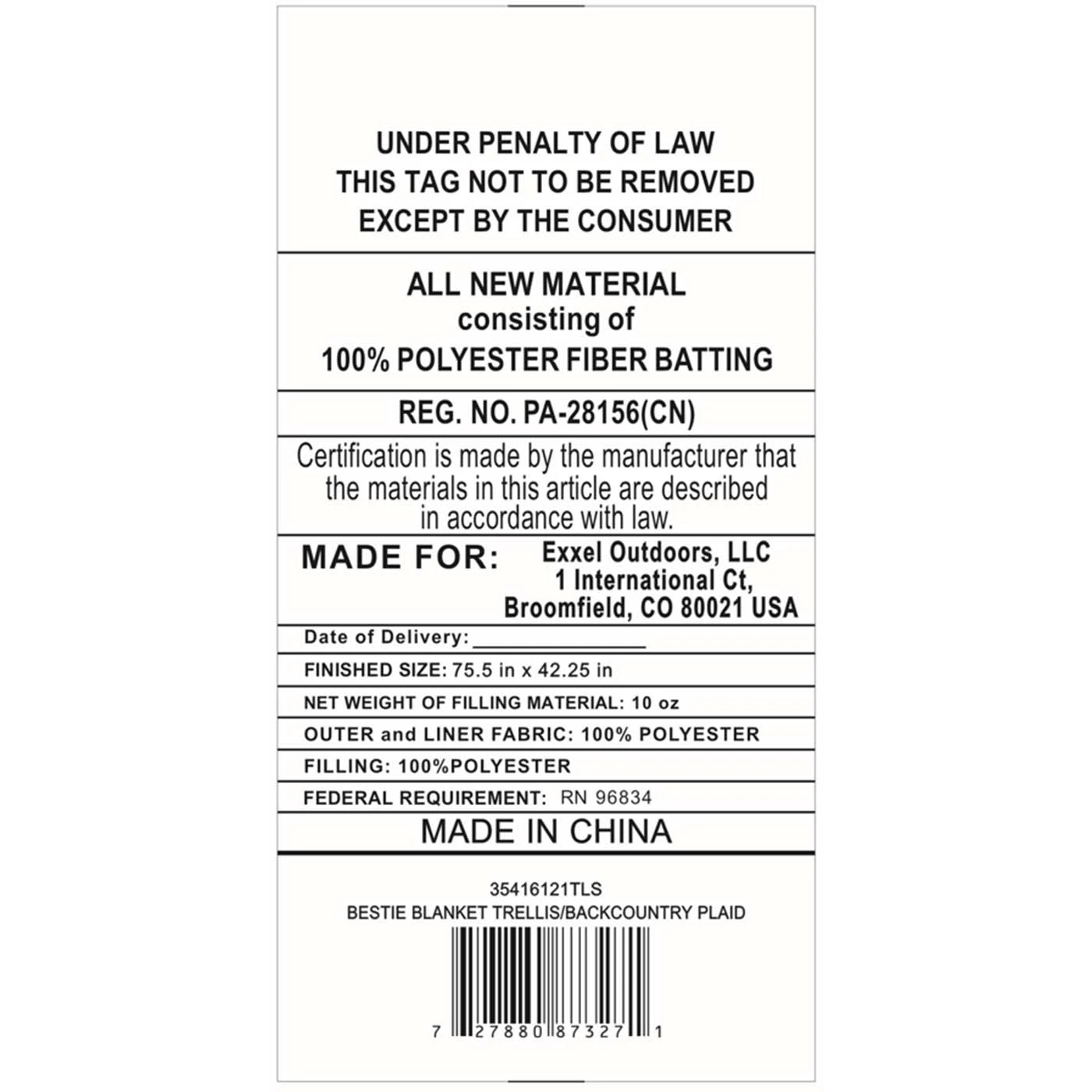 - Shell: 75D Printed Polyester Taffeta